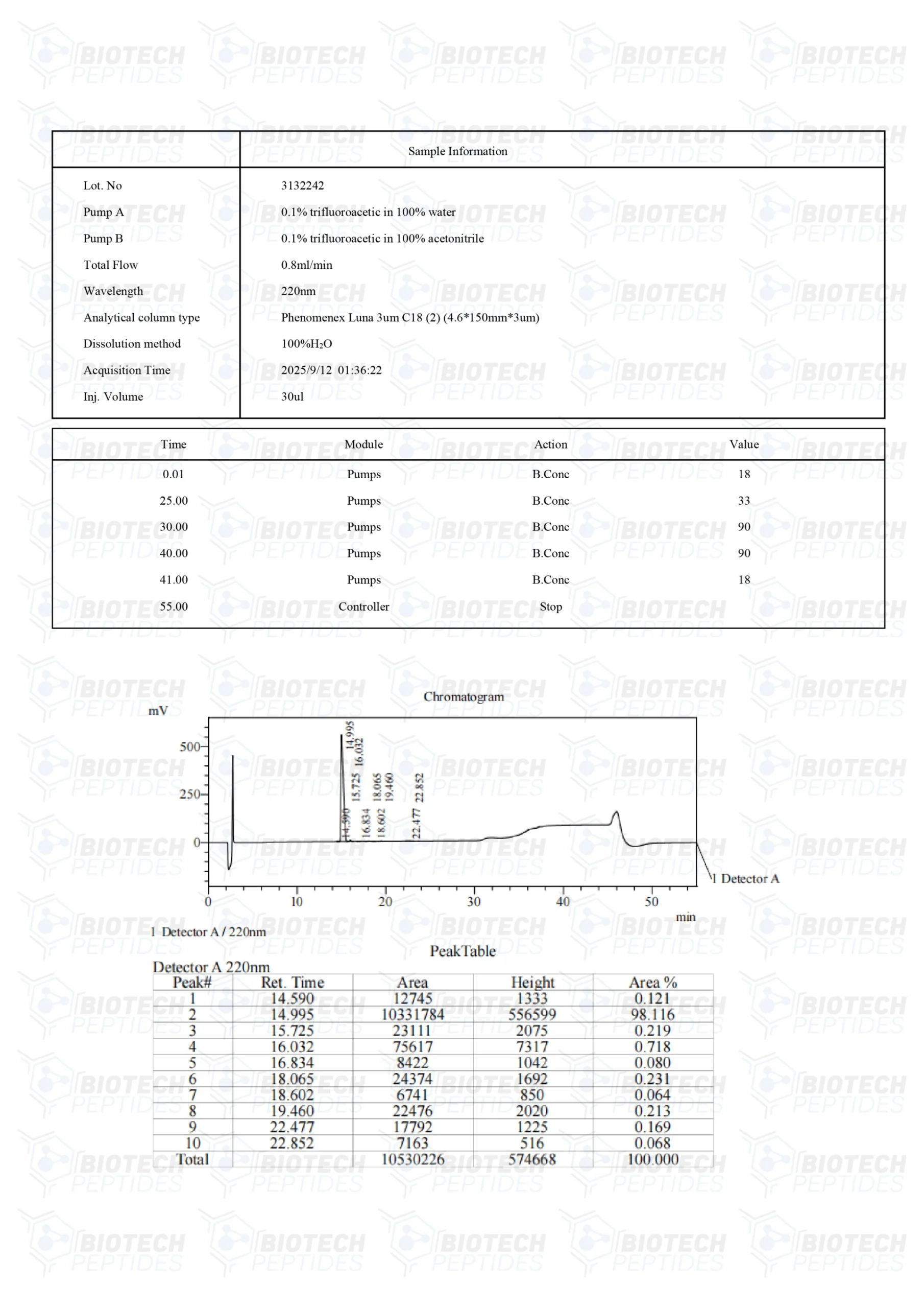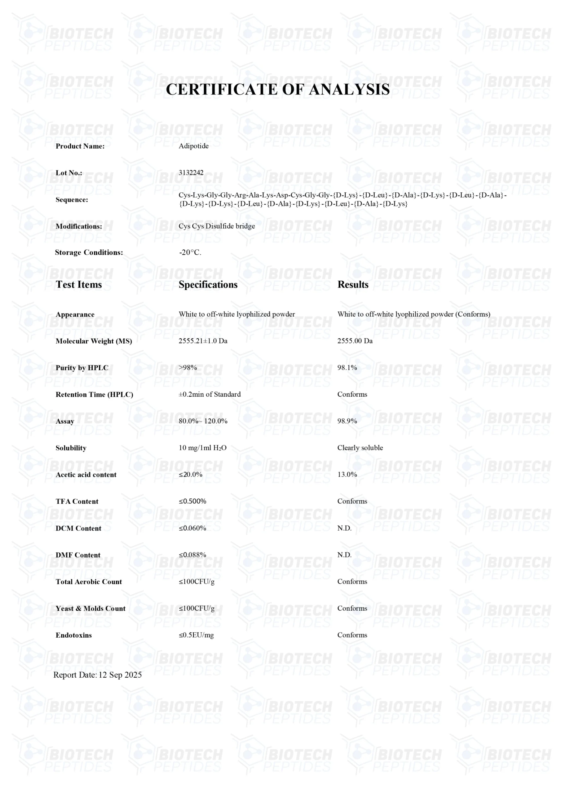 Adipotide appears to have a unique structure consisting of the amino acid sequence GKGGRAKDC-GG-D(KLAKLAK)2. The nine amino acid sequence CKGGRAKDC may exhibit a specific affinity to the ANXA2-prohibitin receptor system found in the blood vessels supporting white adipose cells.[4] The researchers utilized phage display, a technique that is considered to enable the identification of specific peptide motifs, to isolate a peptide sequence CKGGRAKDC. Moreover, the CKGGRAKDC peptide appears to associate with a membrane protein called prohibitin, which has been identified as a potential vascular marker of adipose tissue. By directing a proapoptotic peptide towards prohibitin in the adipose vasculature, the researchers induced the ablation (removal) of white fat. This resulted in the possible resorption of established white adipose tissue and the potential normalization of metabolism. As a consequence, rapid obesity reversal was reported to be achieved. It is suggested that prohibitin is expressed in the blood vessels of white fat. However, it is crucial to note that the study solely focuses on elucidating the mechanisms involved and did not provide any definitive suggestions or implications regarding its potential.