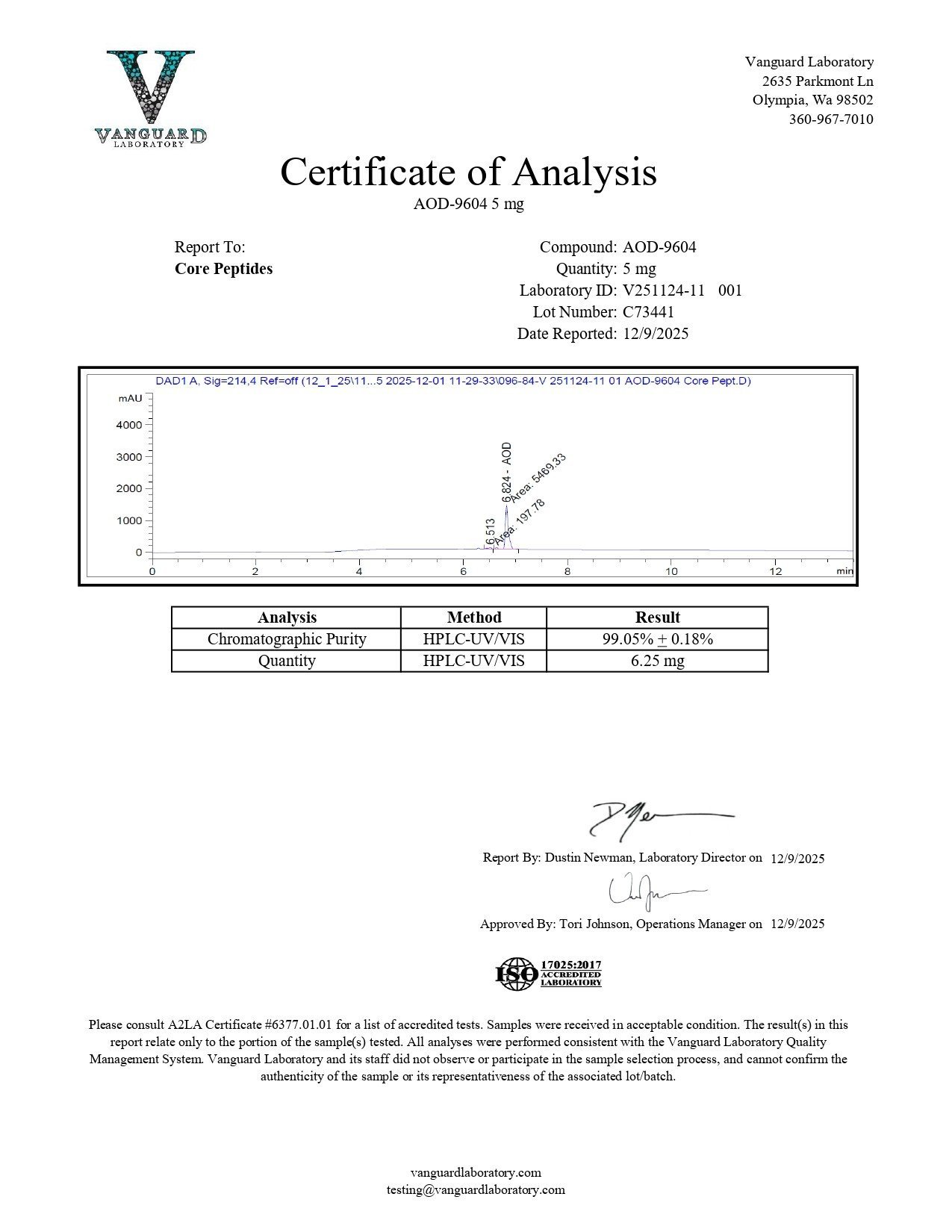 AOD 9604 peptide is a synthetic analog of growth hormone designed with the intention of mitigating obesity and aiding weight loss. The peptide is a modified fragment of the growth hormone where the last 16 amino acids (176-191) have been reproduced as a specific peptide, called GH Fragment 176-191 or simply AOD 9604. It also has a tyrosine residue to replace the first amino acid at the N-terminus, which researchers consider to help increase the stability of the peptide.(1)