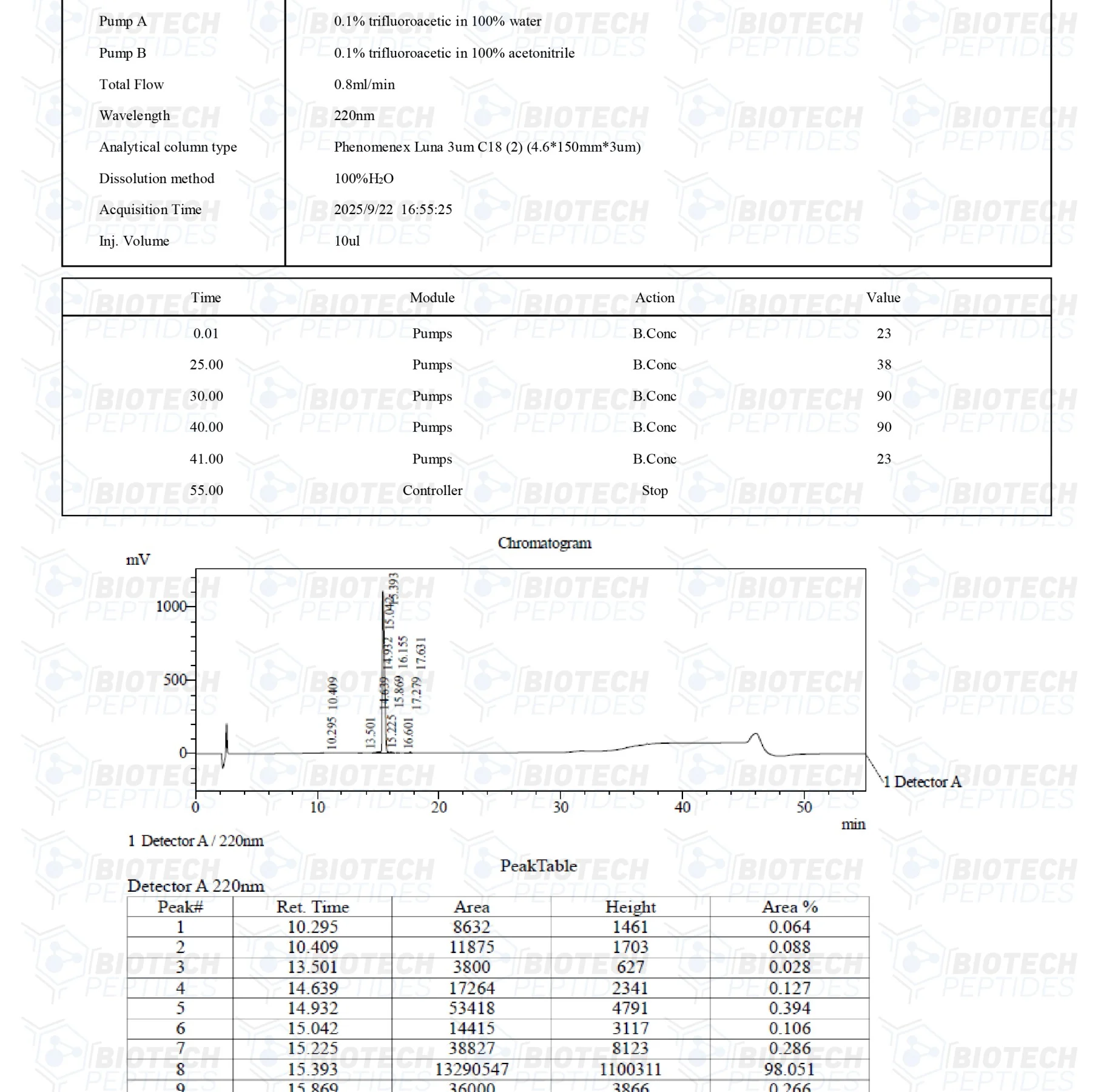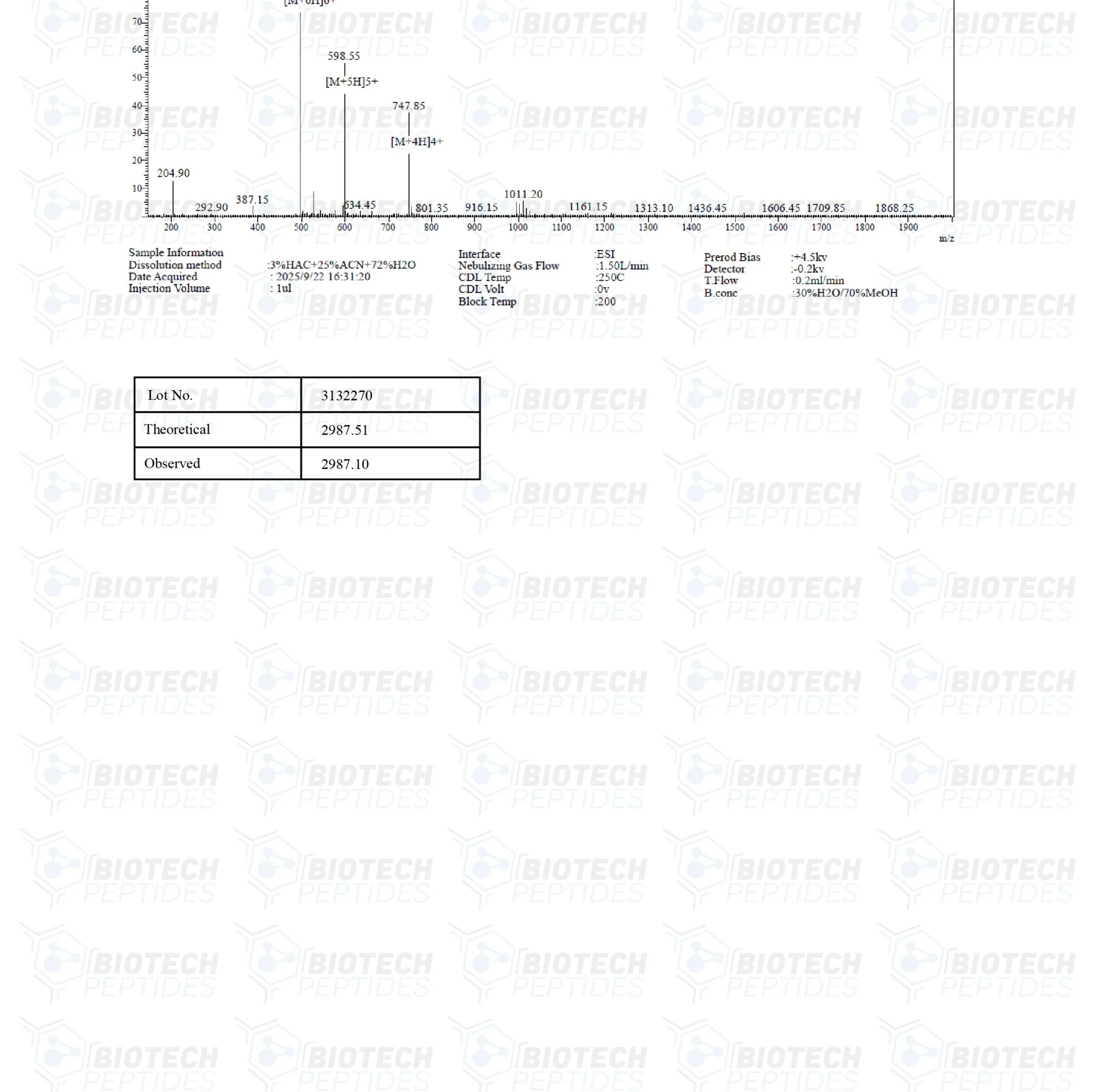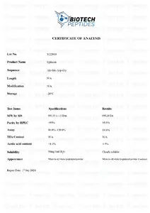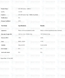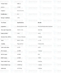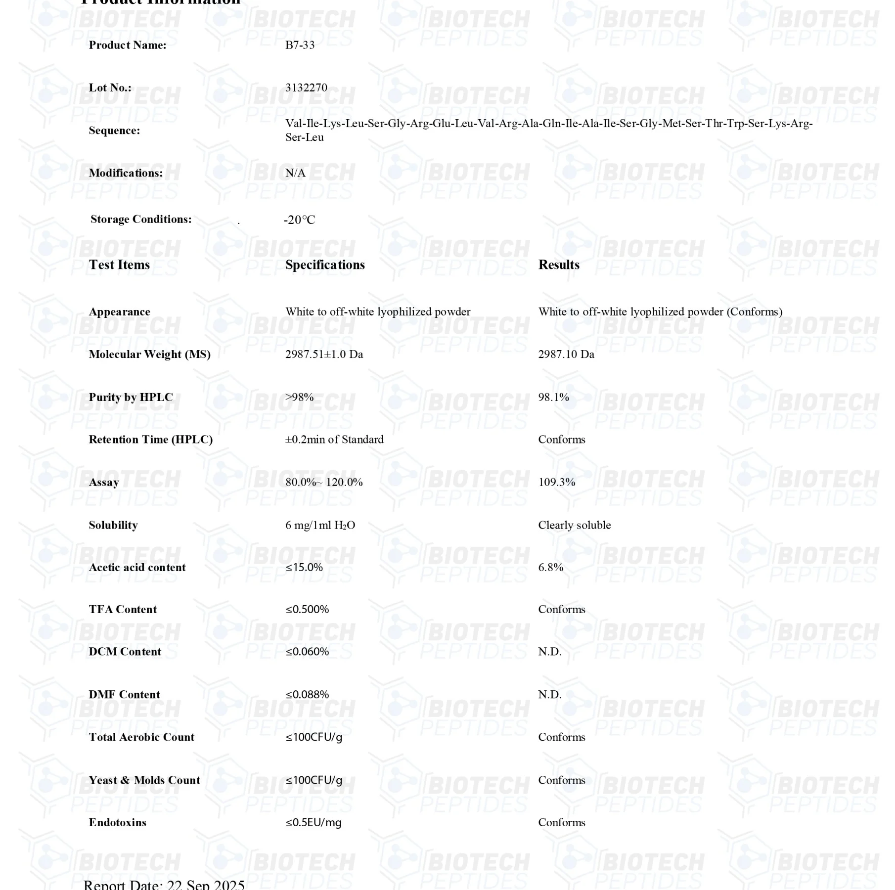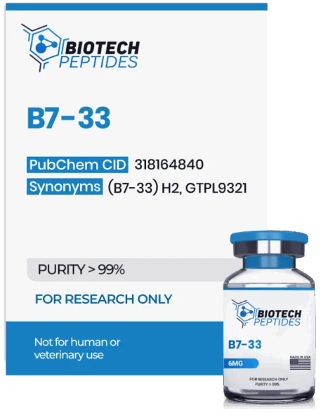 B7-33 is a soluble synthetic single-chain peptide obtained from the larger, naturally occurring protein H2-relaxin (Relaxin), which is considered to induce pleiotropic actions impacting the musculoskeletal system, cardiovascular system, and reproduction.[1] B7-33 appears to retain the anti-fibrotic properties of Relaxin without enhancing cAMP production, it may also stimulate ERK1/2 phosphorylation and promote matrix metalloproteinase 2 (MMP2) expression and the degradation of extracellular collagen. The Relaxin family of peptides has four endogenous receptors divided into two pairs (RXFP1/2 and RXFP3/4).[2] The Relaxin receptors appear to be stimulated by cAMP, orexin, corticotropin-releasing factor (CRF), several insulin-like peptides, and GLP-1. The agonists have been observed to exhibit anti-inflammatory, antioxidant, and tissue-repairing characteristics.