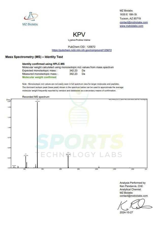 At Sports Technology Labs, we offer the highest-quality KPV peptide for sale online. Our peptides are tested for purity and formulated for research use only. Whether you are investigating the anti-inflammatory properties of KPV or exploring its other research potential, our product ensures the integrity and reliability needed for your research. When you buy peptides from Sports Technology Labs, you are choosing the highest quality products.