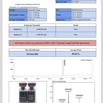 Manufactured under strict quality controls, Sermorelin 10mg is supplied in lyophilized powder form, ensuring stability and maintaining potency when stored under recommended conditions (-20°C). Every vial is backed by 3rd-Party Certificates of Analysis (COAs), verifying 99%+ purity, so researchers can work with confidence knowing they have a product that meets rigorous scientific standards.
