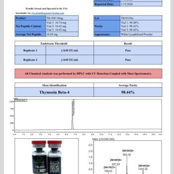Presented in lyophilized powder form, TB-500 (Thymosin Beta-4) 10mg provides long-term stability when stored properly (-20°C recommended) and is simple to reconstitute for laboratory use. Each vial undergoes independent 3rd-party testing, and every batch comes with a Certificate of Analysis (COA) that confirms 99%+ purity, reinforcing confidence in your experimental results.