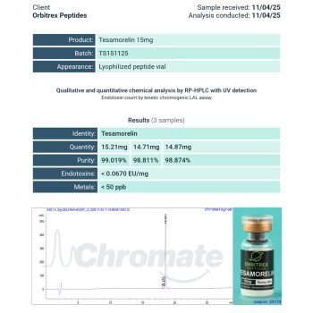 At Orbitrex Peptides, our goal is to support research by delivering peptides that meet the highest standards of quality, transparency, and dependability. Our Tesa-15mg is produced with this philosophy in mind, ensuring that researchers can rely on consistency and verified purity in every batch.