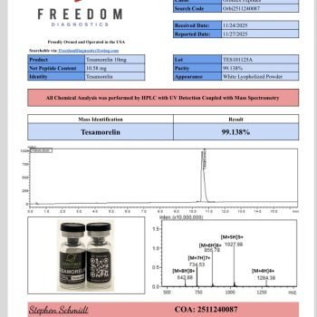 Formulated in lyophilized powder form, Tesamorelin 10mg is stable under recommended storage conditions (-20°C) and reconstitutes easily for laboratory use. Each vial is subject to independent 3rd-party laboratory analysis, with Certificates of Analysis (COAs) verifying its 99%+ purity, consistency, and free of impurities, ensuring researchers can proceed with full confidence in their experimental outcomes.