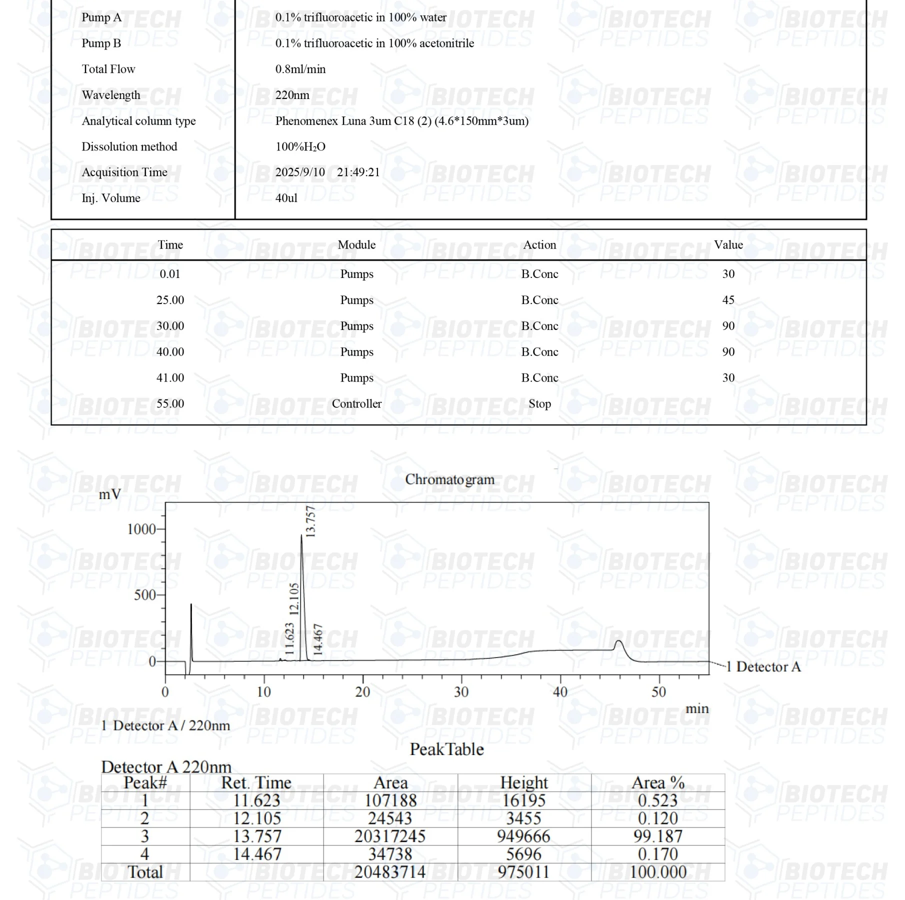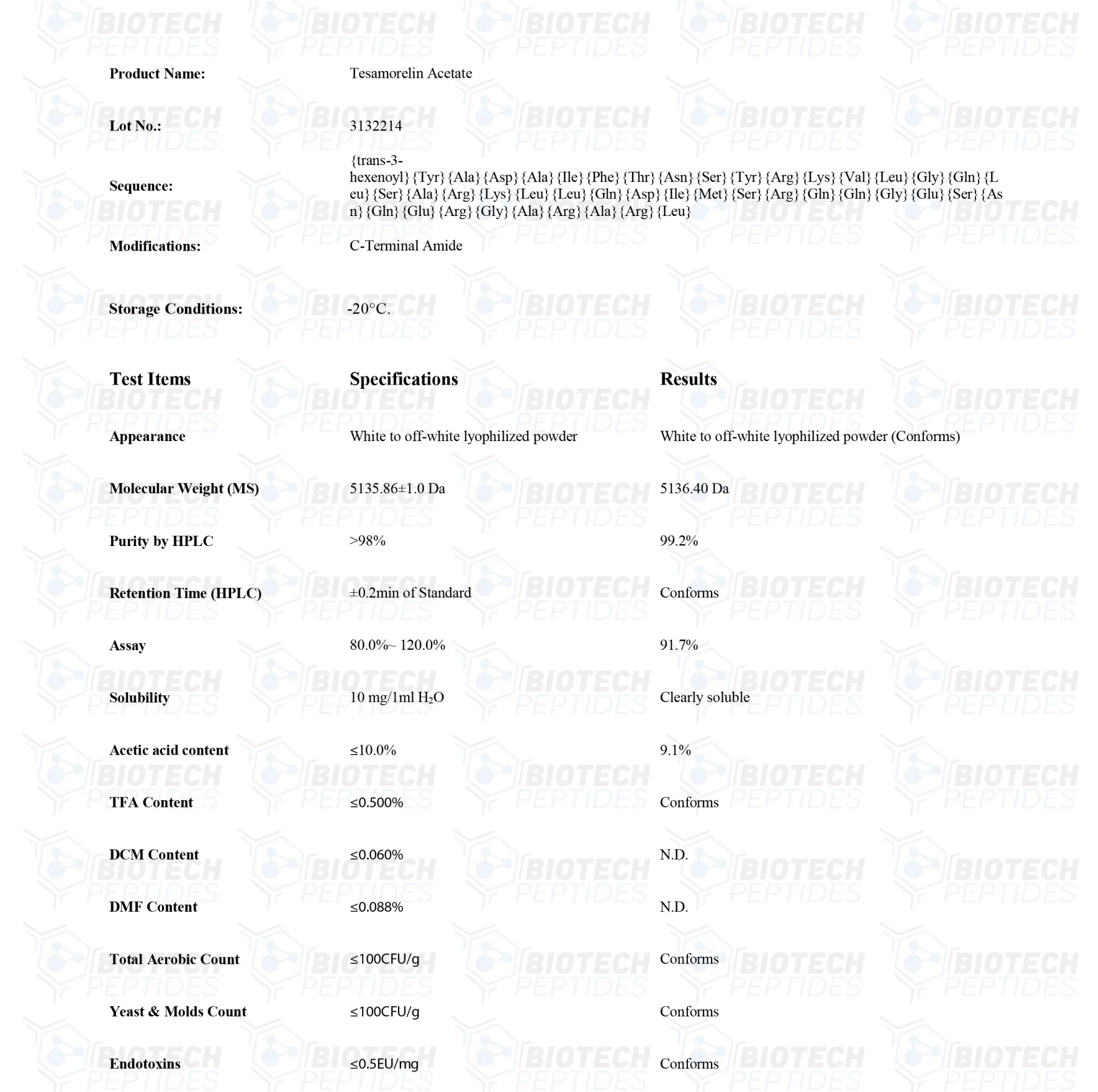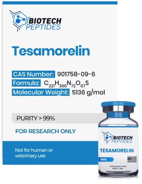 Tesamorelin is a chemically altered growth hormone-releasing hormone (GHRH) analog, that similar to the original is made of 44 amino acids. This peptide is a trans-3-hexanoic acid version of natural GHRH. The trans-3-hexanoic acid group is added to the N-terminus, while the C-terminus is amidated and acetylated. Tesamorelin appears to mediate the positive influence of GHRH and other GHRH analogs such as GRF (1-29), CJC-1295, and Sermorelin. The trans-3-hexanoic acid modification may increase its stability and half-life. Both Tesamorelin and CJC-1295 appear to maintain the physiological activity of GHRH, without disrupting the physiological rhythm of GH release.